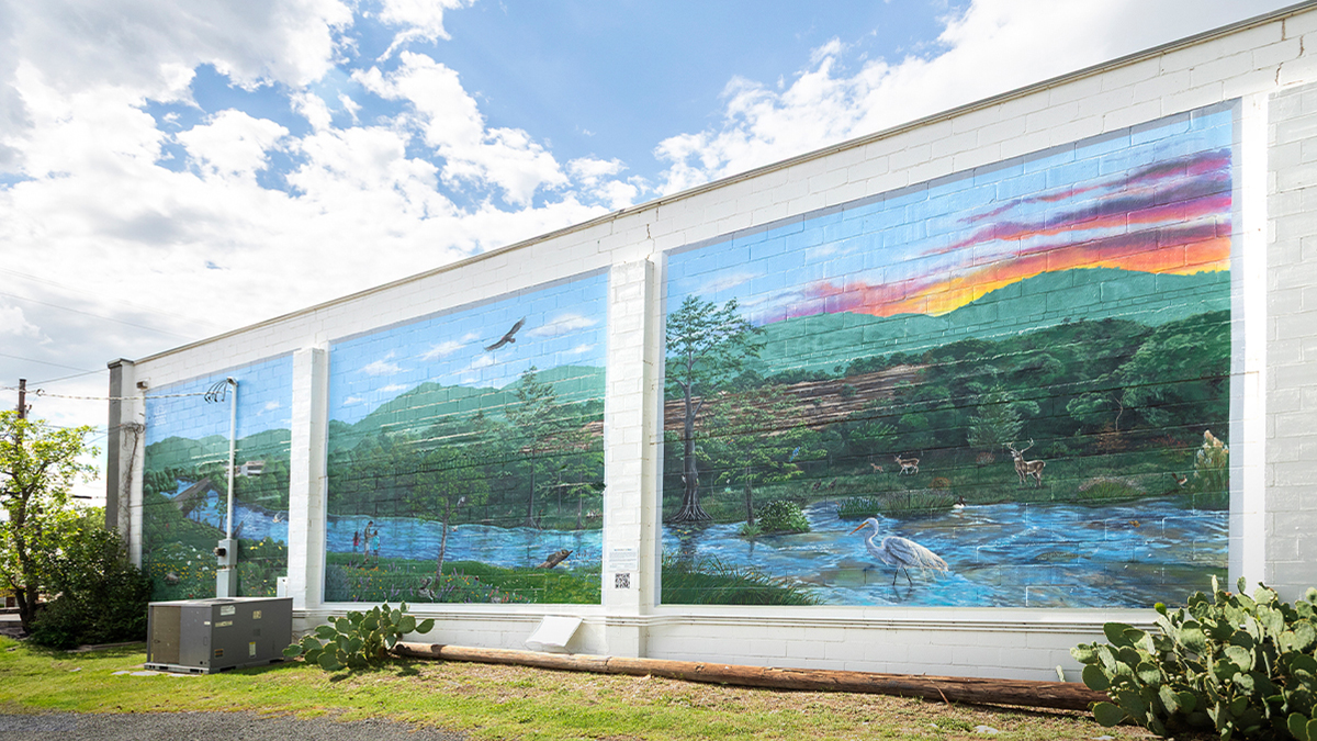 Kerrville’s enthusiasm for art is also apparent through its multitude of outdoor murals. One of the newest is an expansive piece called “Regenerate,” painted on the Voelkel building near downtown. Designed and painted by local artists Sarah and Andrew McWilson, this refreshing mural is an impressionistic design depicting two boys shelling native Texas pecans. On another downtown mural celebrating Kerrville’s character, an armadillo, a roadrunner and larger than life wildflowers come together in vibrant colors. And in nearby Ingram, a series of fifteen murals, restored in 2017, depict life in the Hill Country between the 1880s and the 1920s.