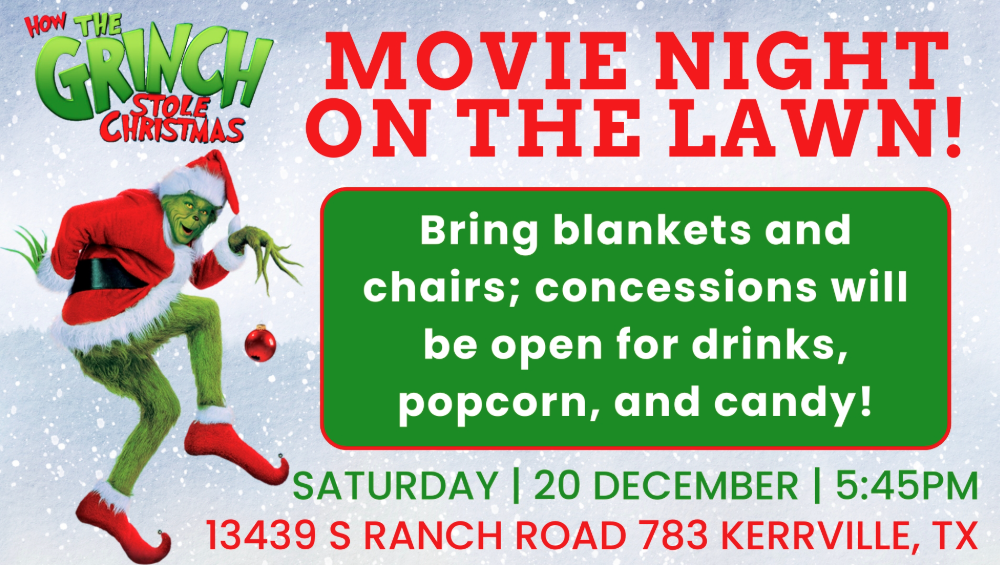 Get ready for a festive evening under the stars at The Ridge Marketplace in Kerrville, Texas! Join us for a free Movie Night on the Lawn, featuring the holiday classic How the Grinch Stole Christmas.