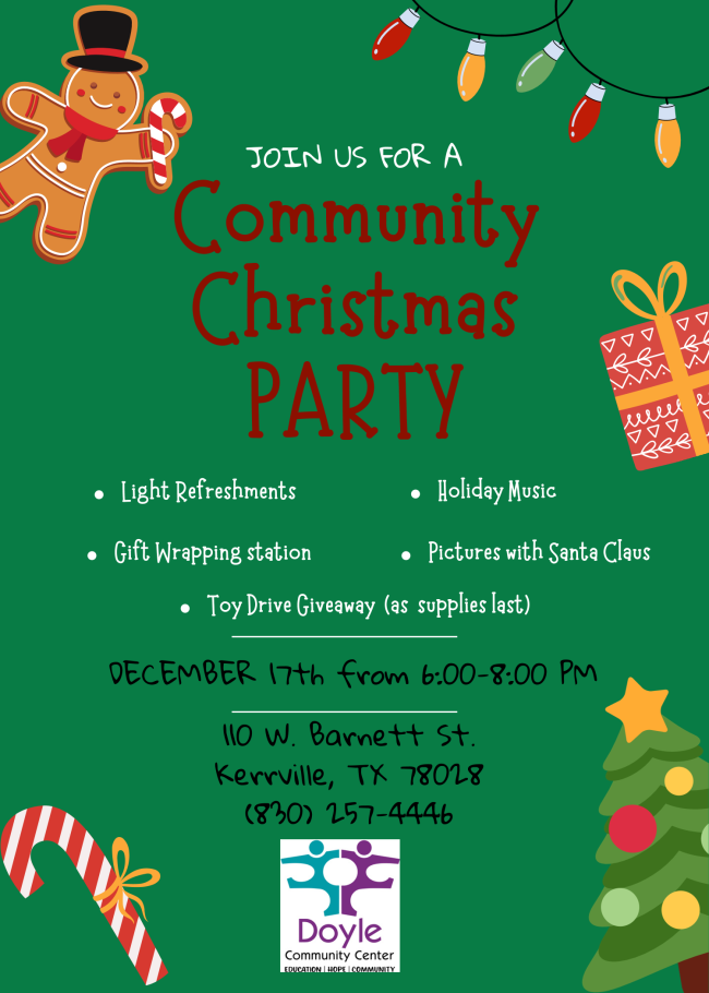 Doyle Community Center 110 W Barnett St, Kerrville, TX, United StatesCelebrate the season at the Community Christmas Party on Wednesday, December 17, from 6:00–8:00 p.m.! Enjoy festive activities, holiday treats, and fun for everyone in a warm, cheerful atmosphere. The community toy drive toys will be distributed while supplies last, and there will be a gift-wrapping station, light refreshments, and pictures with Santa. Come connect […]