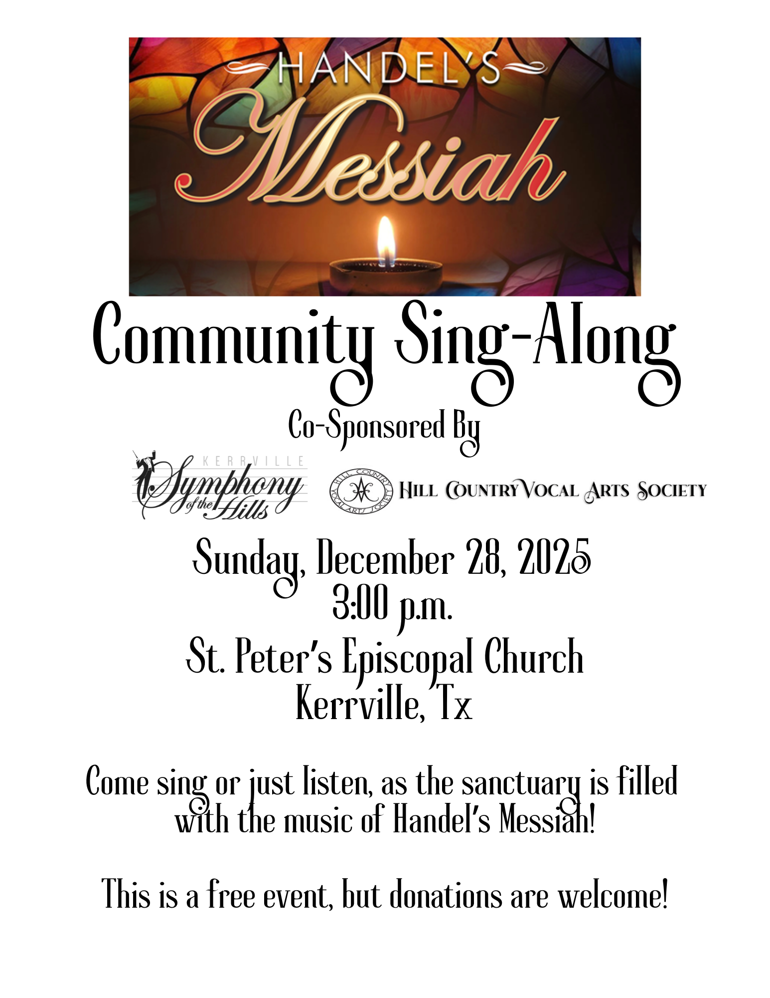 St. Peter's Episcopal Church 320 Saint Peter St, Kerrville, TX, United StatesHill Country Vocal Arts Society, Symphony of the Hills, and St. Peter’s Episcopal Church are hosting the Community Sing-Along of Handel’s Messiah. This year begins a new collaboration between the Symphony of the Hills and the Hill Country Chorale in presenting this annual event, held on the Sunday after Christmas. It brings together musicians from […]